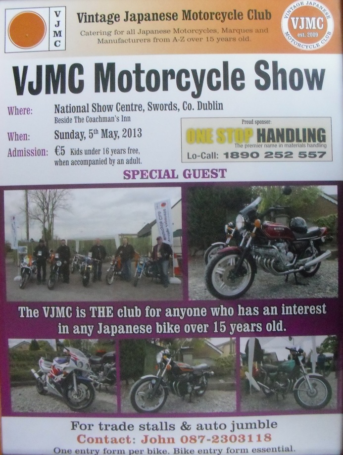 The Vintage Japanese Motorcycle Club presents the VJMC Motorcycle Show at the National Show Centre, Swords, Co. Dublin on Sunday 5th May 2013. The venue is located opposite the Coachmans pub just off the N1 North of Dublin Airport.